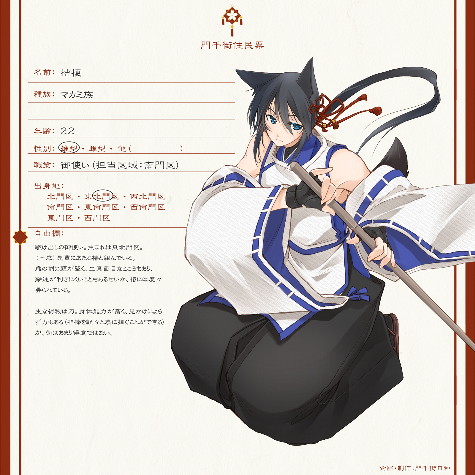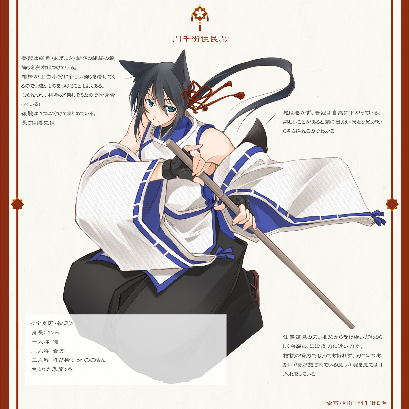 主な得物は刀。身体能力は高く、見かけによらず力もあるが、術はあまり得意ではない。